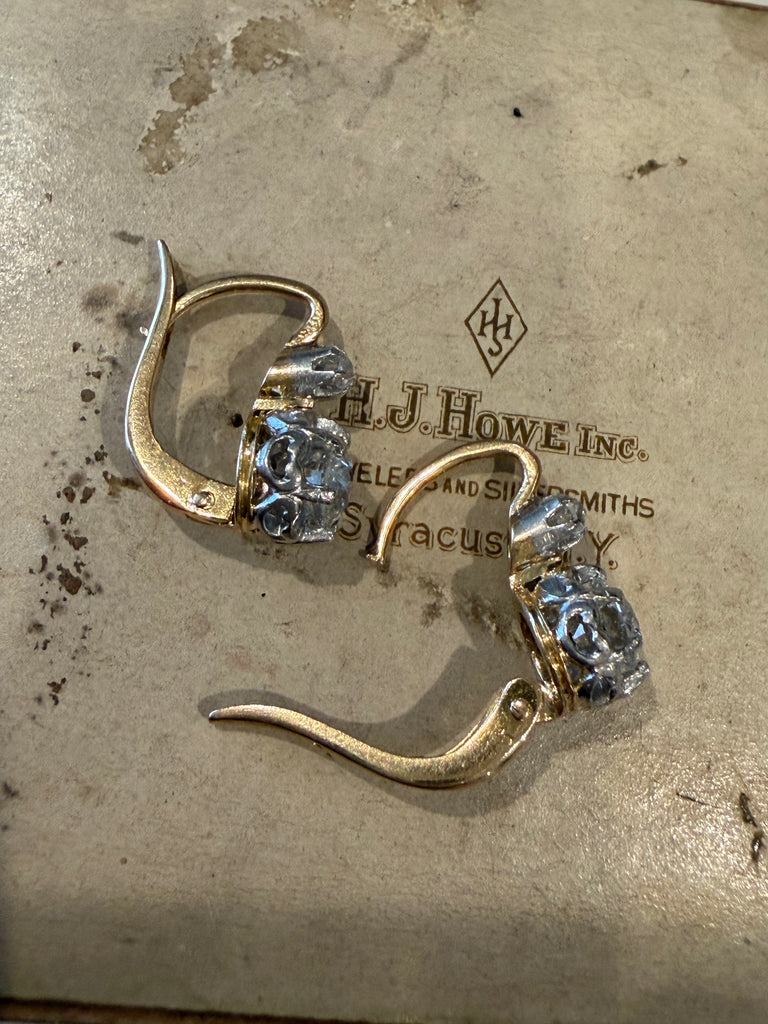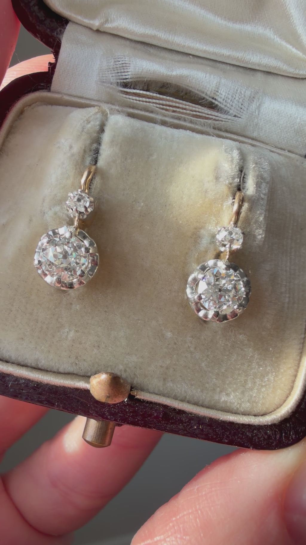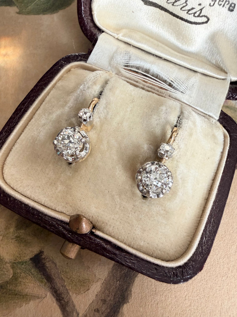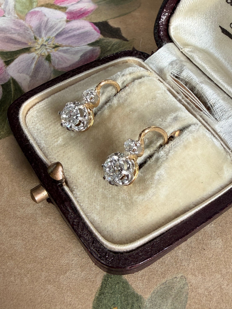 Dating to the turn of the 20th century, these antique French earrings showcase a dazzling duo of old mine-cut diamonds, each weighing approximately 0.46 carats, crowned by a pair of sparkling old mine-cut diamonds. Crafted in 18k gold and platinum, bearing French eagle's head hallmarks, they’re thoughtfully designed to nestle just beneath the earlobe for comfort.
