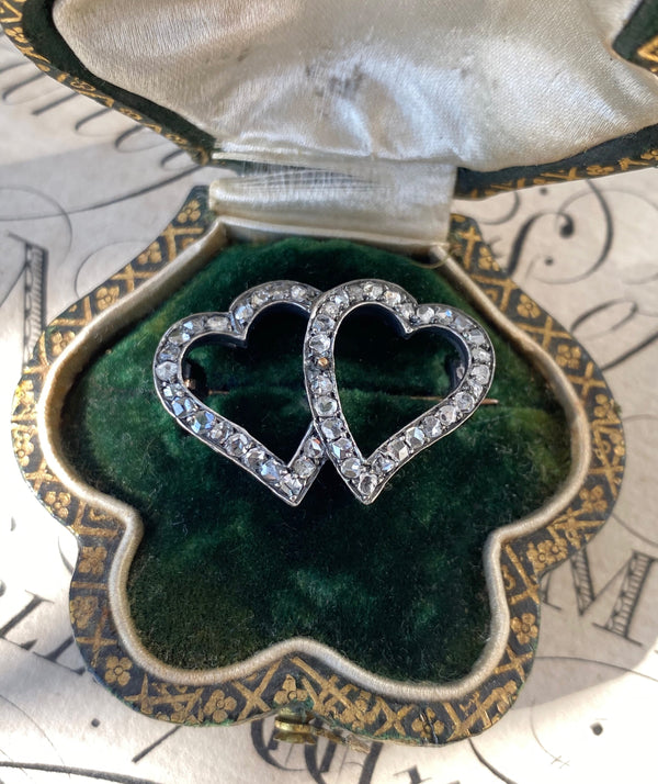 French 19th C Rose Cut Diamond Twin Heart Brooch