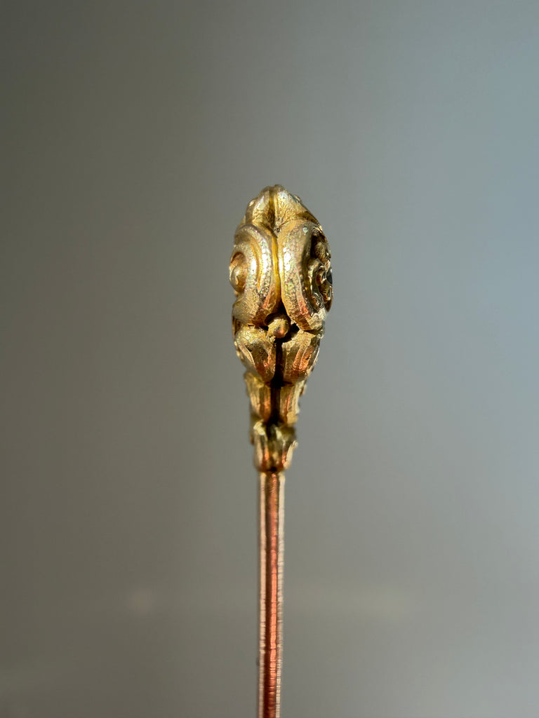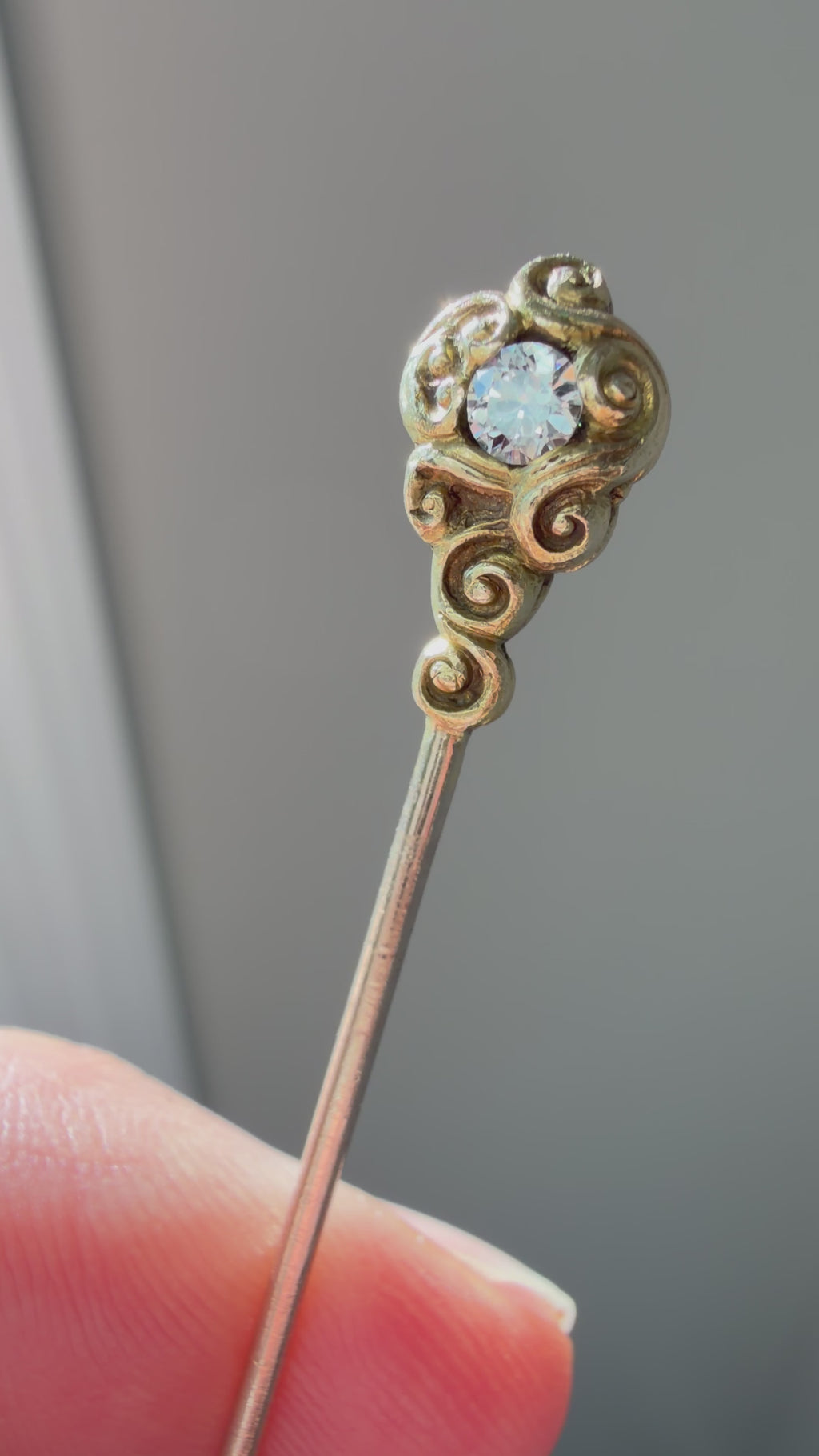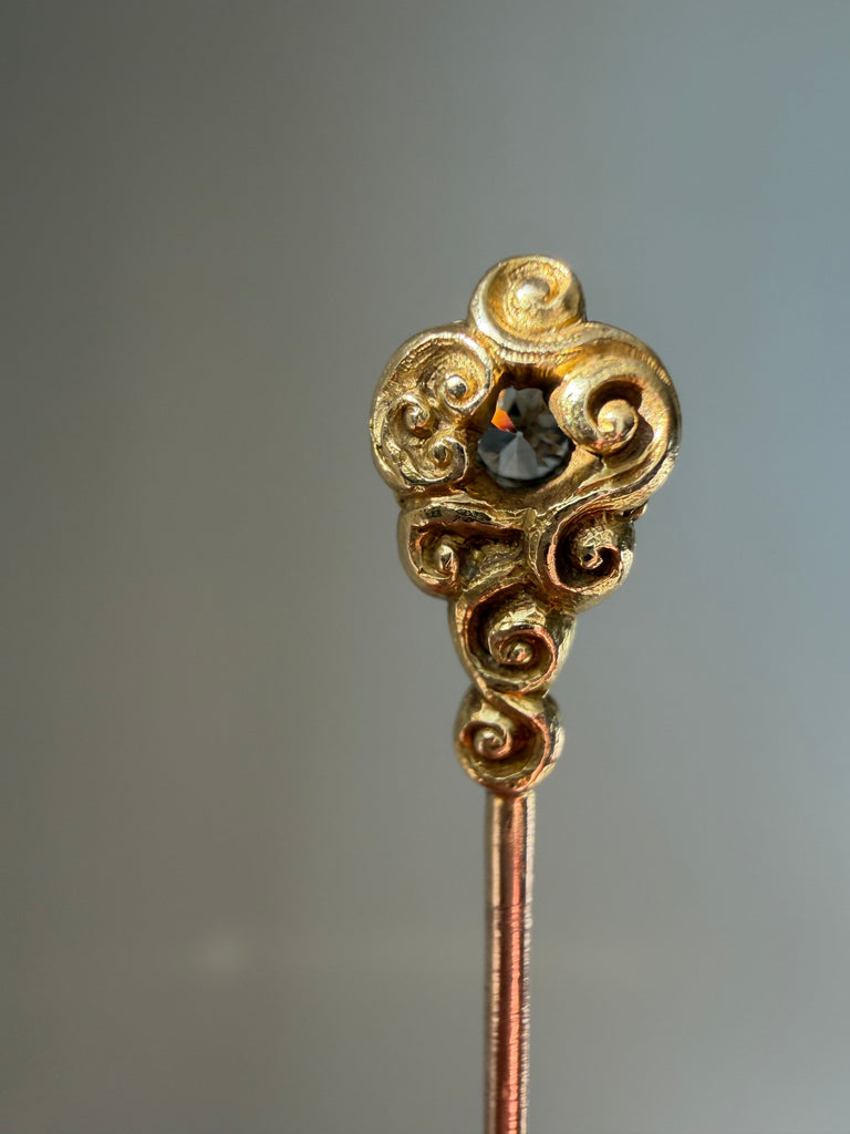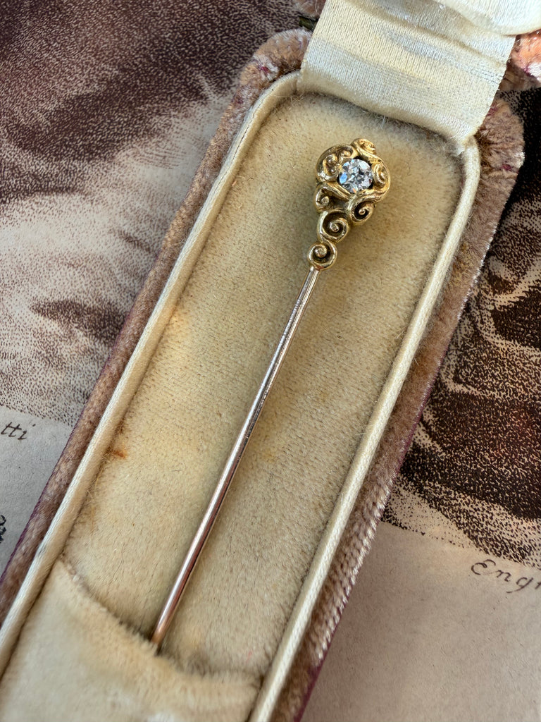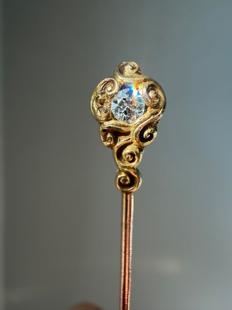 Tiny wearable works of art, so often overlooked yet full of charm, stickpins are wonderful conversation starters when worn. Flowing lines and textured hand-chasing draw the eye to a lively .30 carat old European-cut diamond in this example.