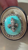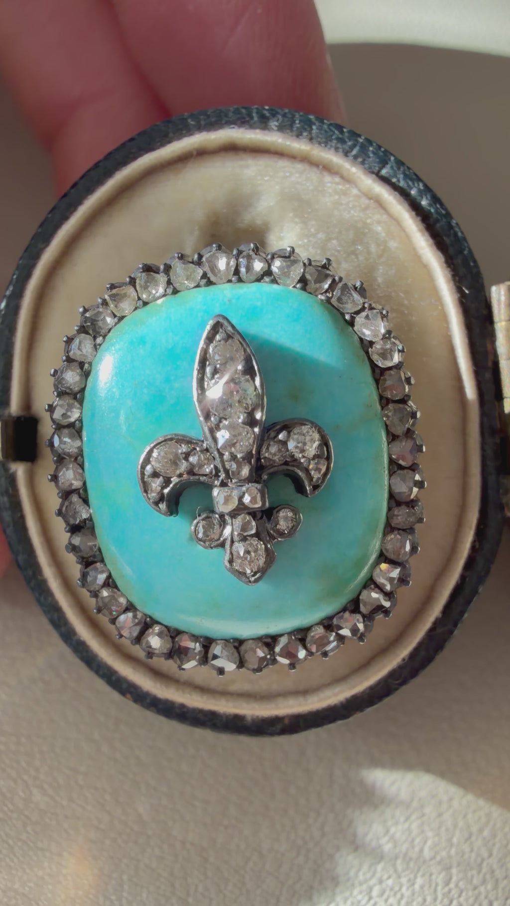 A beautifully crafted 19th-century convertible brooch, made in 18k gold and silver and centered with a vivid oval turquoise. The stone is overlaid with a fleur-de-lis motif set with softly sparkling rose-cut diamonds, framed by glinting rose cut diamonds.