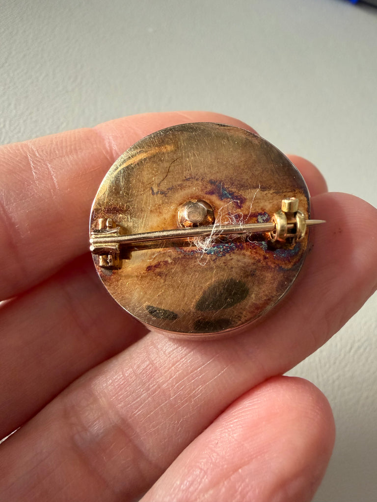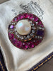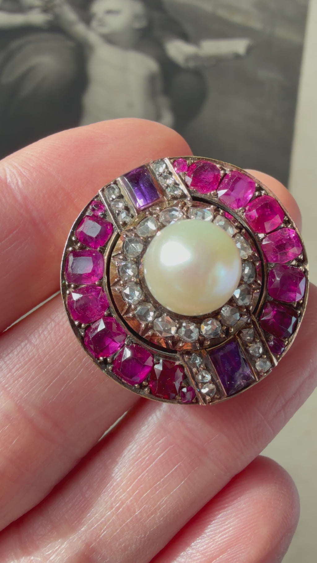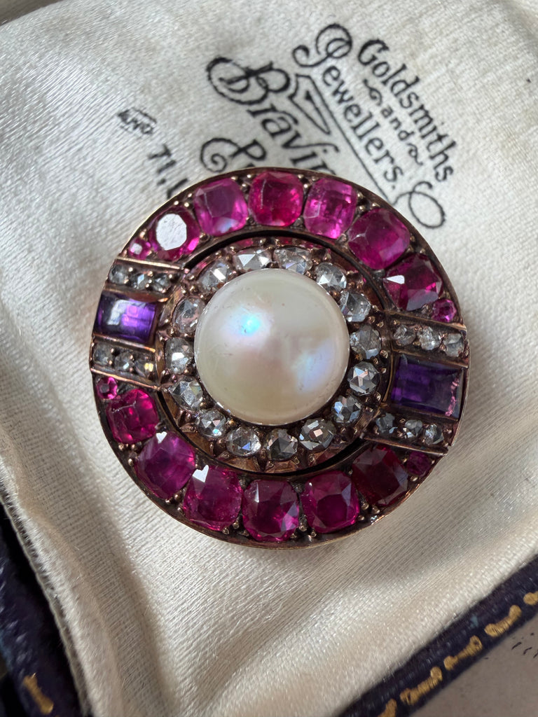 An elegant antique brooch, distinguished by a saturated and thoughtfully composed gemstone palette. At its center rests a luminous pearl displaying soft orient and gentle iridescence prized in the Victorian era. The pearl is encircled by sparkling rose-cut diamonds, wrapped in a vivid border of raspberry red rubies, punctuated by buff top amethyst accents that introduce a subtle contrast and interest to the design.