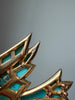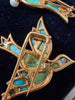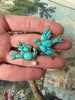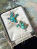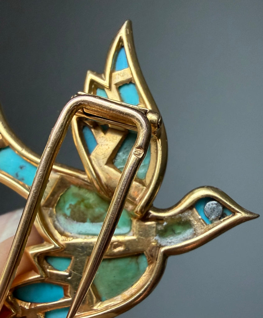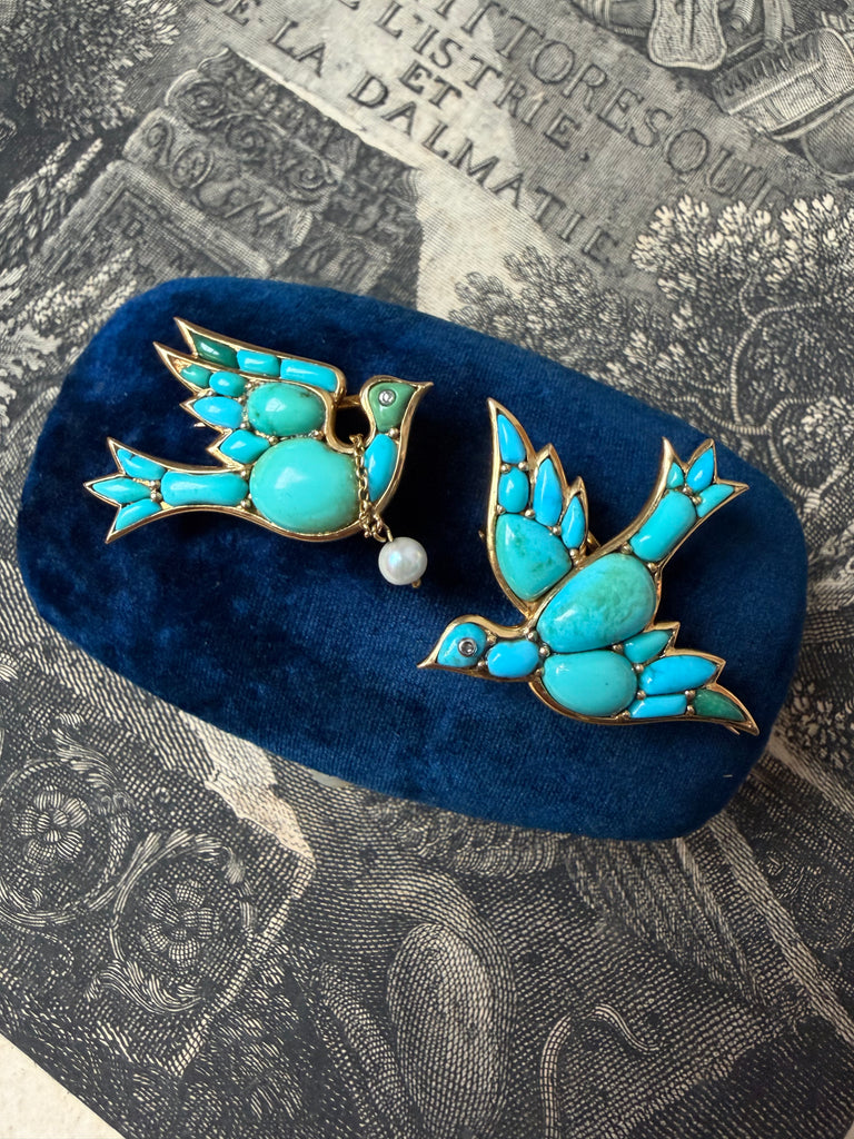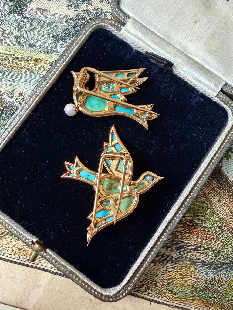 These delightful French Retro clips take the form of two bright doves in flight, fashioned entirely from turquoise cabochons. Their plump, smoothly polished turquoise, each in its own shade of robin’s egg and cerulean, lend the pair a storybook charm. Each dove features a tiny rose cut diamond eye, while one carries a petite pearl suspended from its beak, a sweet nod to the age-old symbolism of birds as messengers of affection. Whether worn together in flight or perched separately, they add a cheerful touch all wrapped in the unmistakable elegance of French workmanship. Their graceful forms, subtle tonal variations, and whimsical charm evoke the artistry of Cartier and the fluid, sculptural elegance of Belperron.