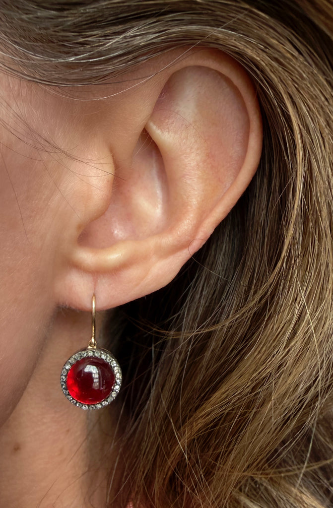 Once a pair of antique cufflinks, these romantic conversion earrings glow with wine-red cabochon garnets framed in glittering rose-cut diamonds.