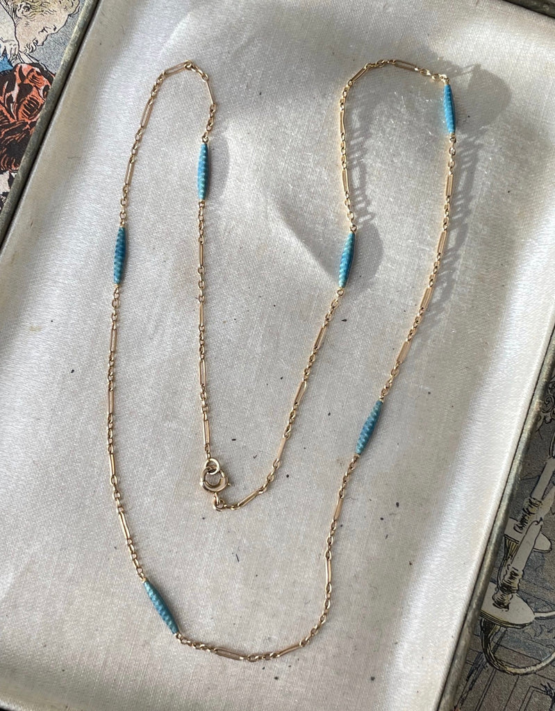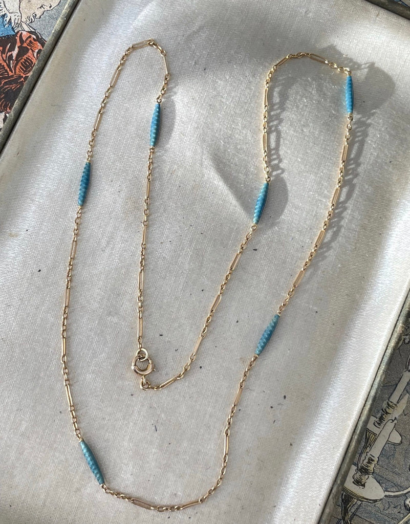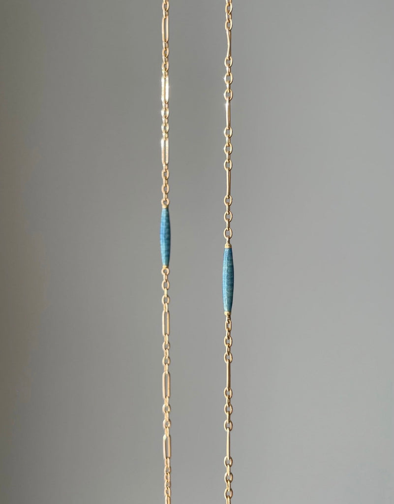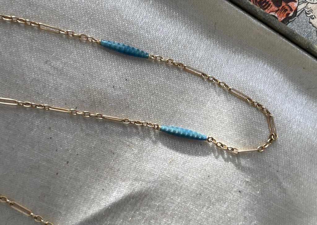 Art Deco 14K Blue Guilloche Enamel Station Necklace Chain