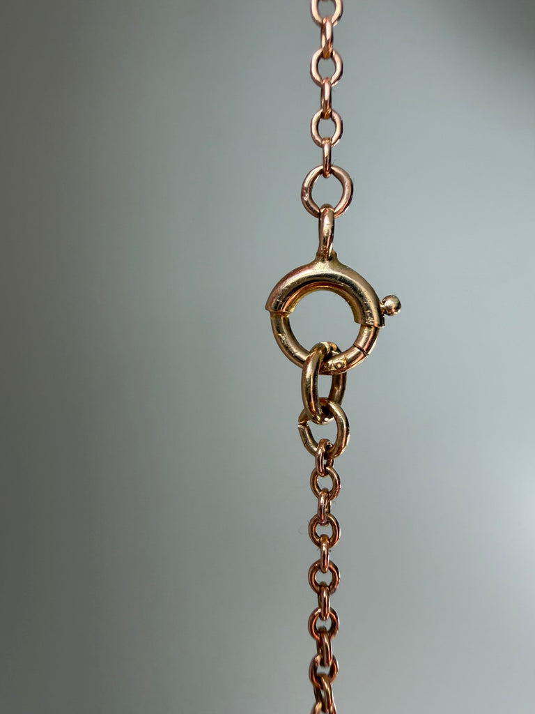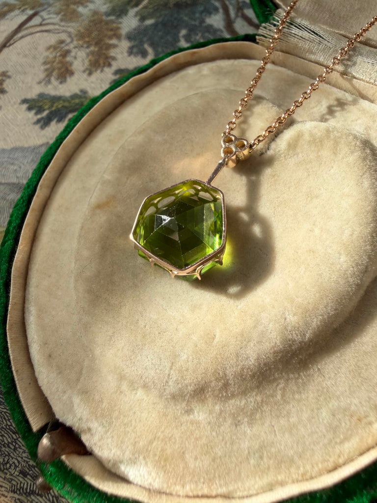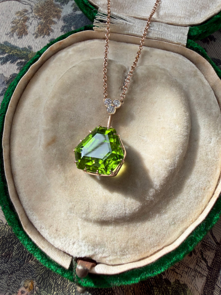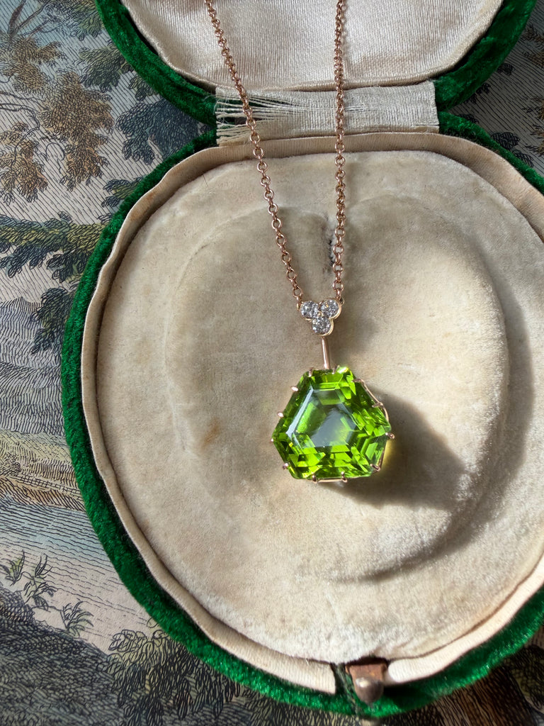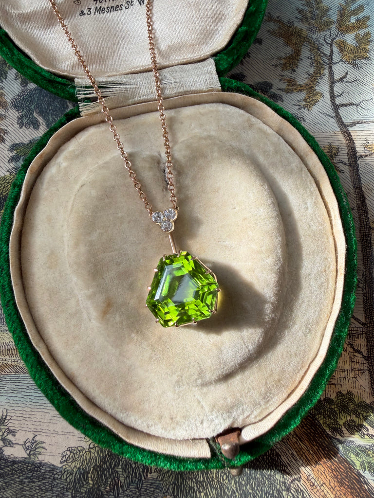 This charming Edwardian lavaliere necklace features a delicate trefoil of old-cut diamonds from which a bright apple green shield shaped peridot is suspended. Its crisp geometry and saturated color make it feel surprisingly modern. Crafted in 9k rose gold. Circa 1900.