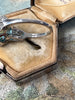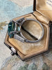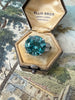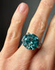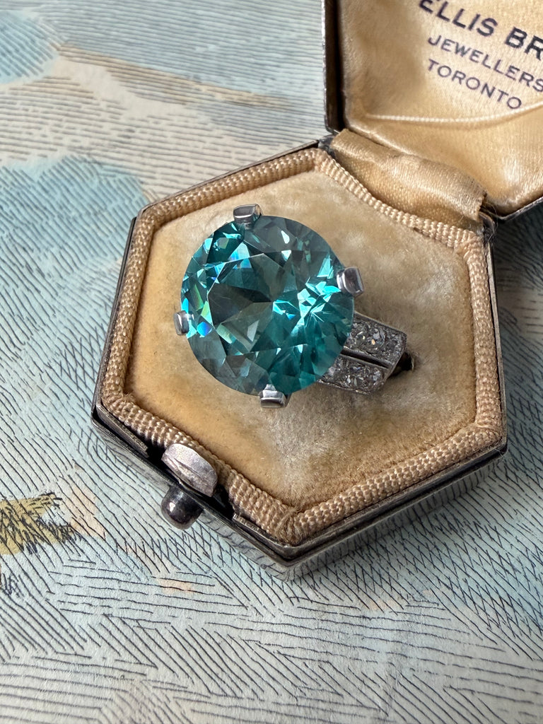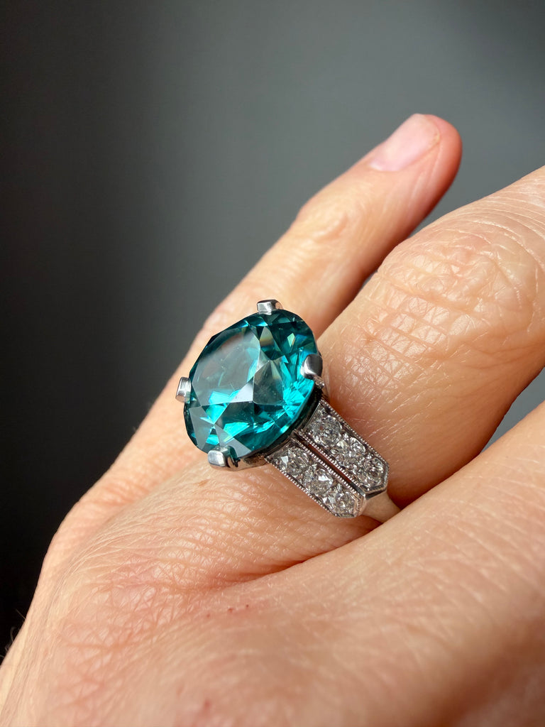 This striking mid-century ring captures the era’s love of bold scale, vivid color, and meticulous craftsmanship. Showcasing a remarkable green blue zircon, weighing 11.69 carats, this gemstone was highly prized in the mid-20th century for its diamond-like brilliance and lively dispersion. The zircon is set in platinum and flanked by two rows of sparkling old European cut diamonds. The substantial mounting is is the perfect balance of presence and clean lines. Accompanied by a GIA gemstone certificate. Currently a ring size 6.