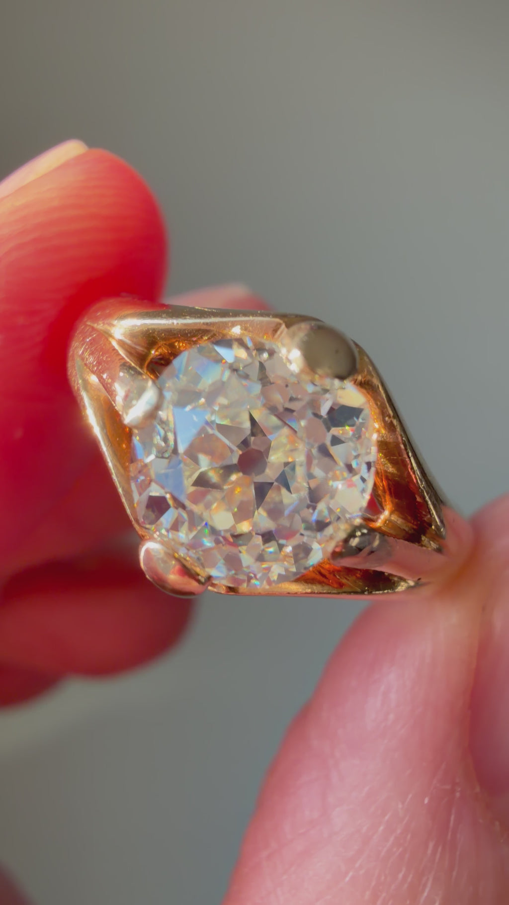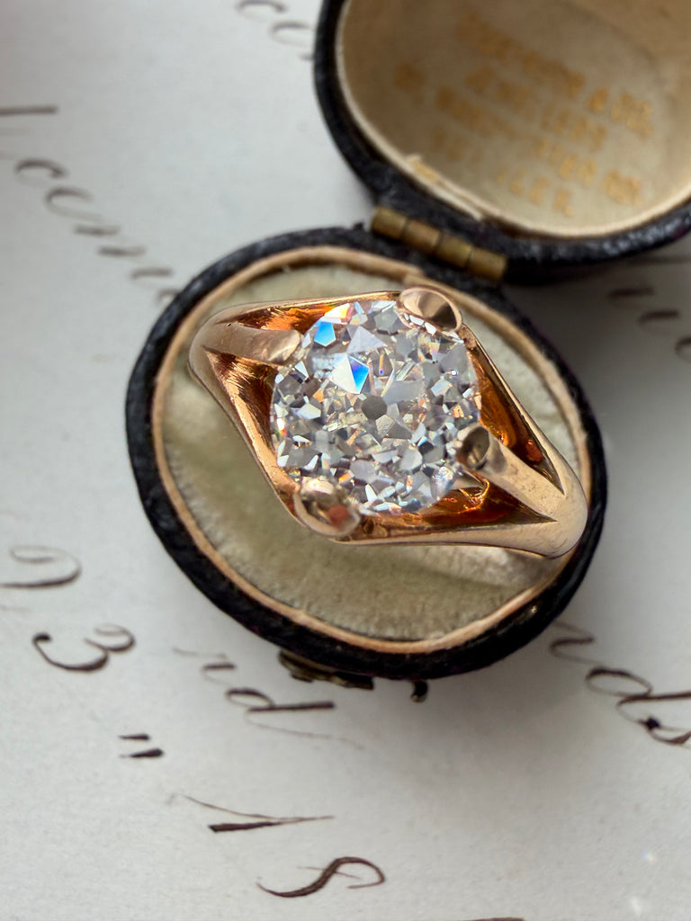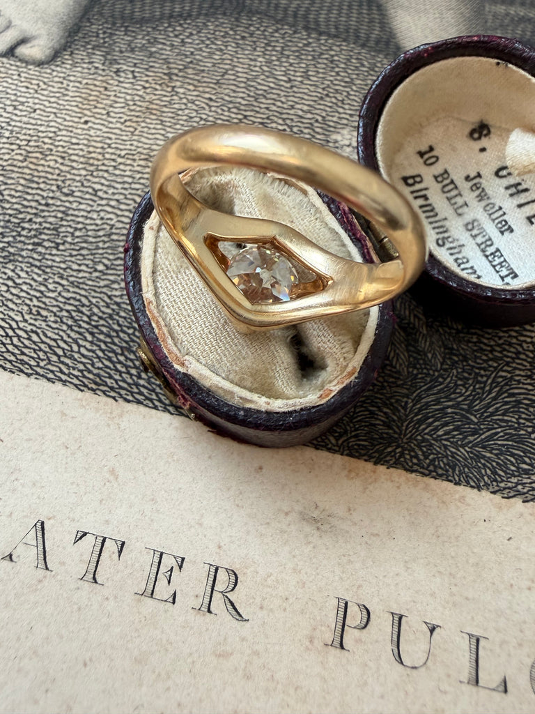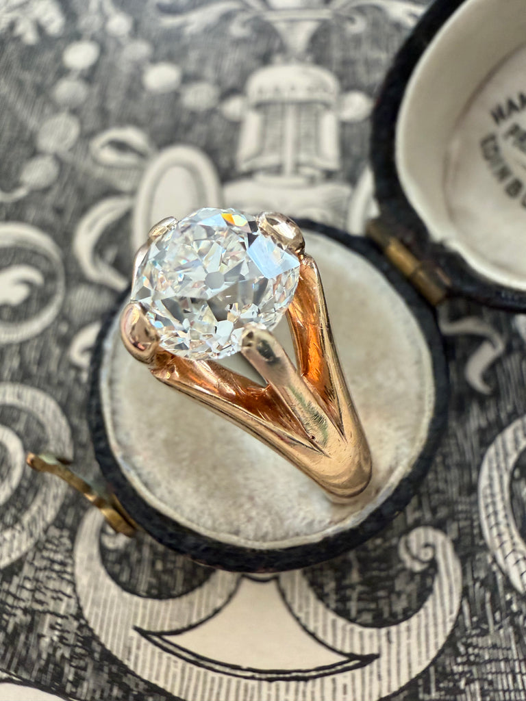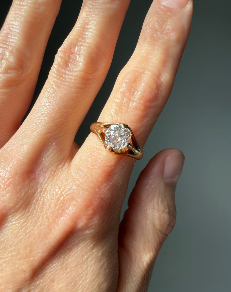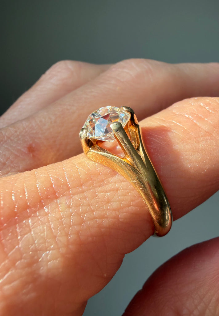 A study in refined simplicity, this antique belcher-style ring is distinguished by its elegant proportions and sculptural presence. Graceful prongs lift a lively 1.89 carat old mine-cut diamond high above the finger, allowing lots of light to enter and offer an unobstructed view of the stone from every angle. The diamond is rich in character, its broad, chunky facets creating a lively play of light, further enhanced by a subtle kozibe effect—the poetic reflection of the open culet softly mirrored across the table. A jewel of understated elegance.