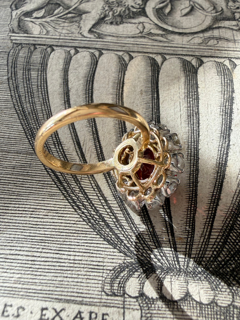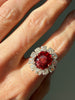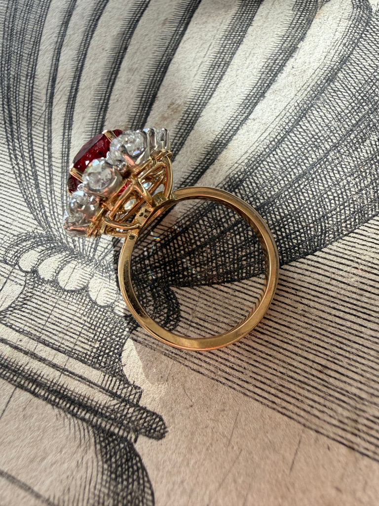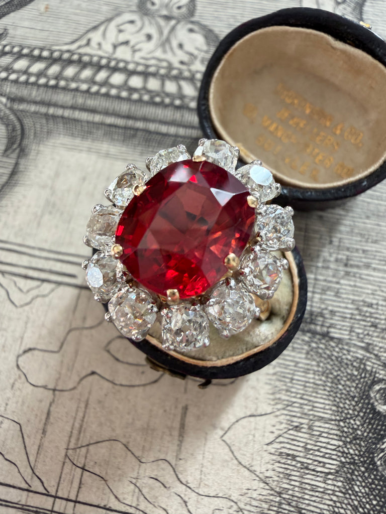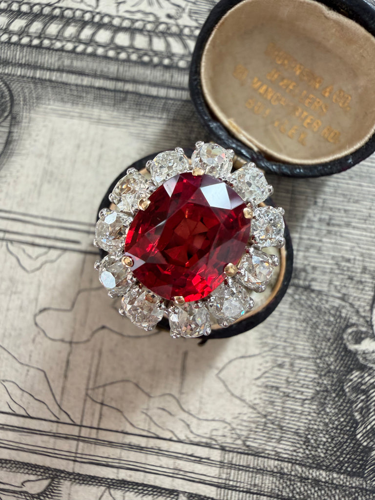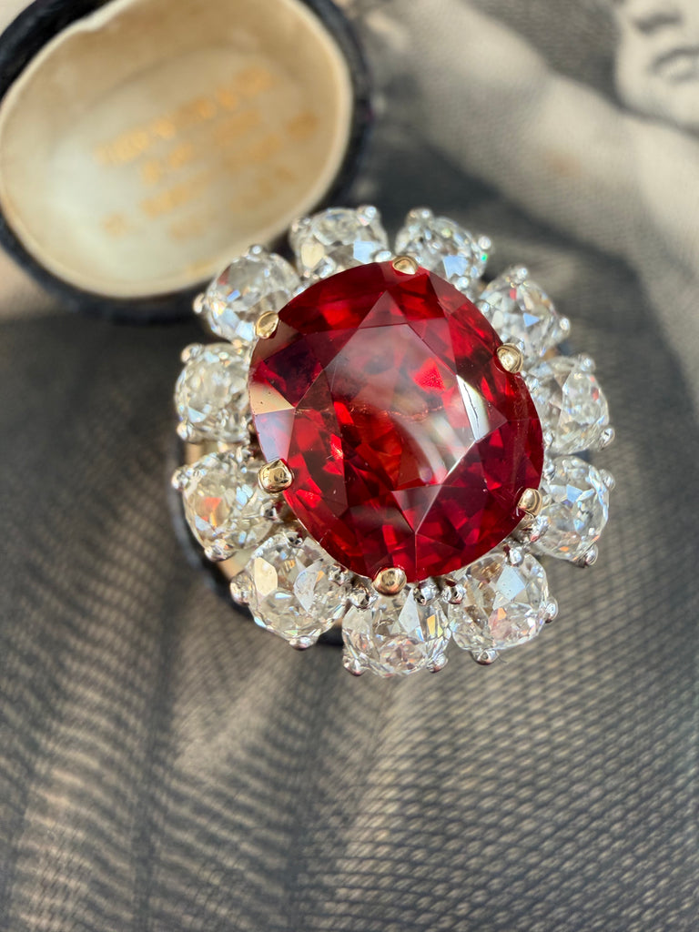 Originally the jeweled top of a 1940's Mauboussin clip, the face of this ring has been expertly reimagined into its current form. At the center sits a vivid 6-carat red spinel, accompanied by a GCS report confirming Burmese (Myanmar) origin with no indications of heating. Encircling the spinel is a halo of approximately 2.75 carats of chunky old mine cut diamonds, their broad facets and high crowns lending the soft, romantic brilliance unique to early hand-cut stones. Currently a ring size 6.25