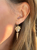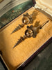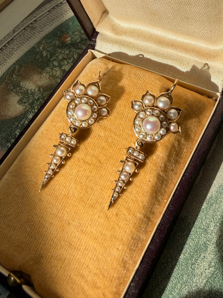 These romantic Victorian earrings showcase tops abloom with a glowing pearl cluster, each pearl showing those soft pink and green overtones collectors adore. The petal-shaped crown suspends a slender, tapered drop studded with graduated pearls and finished with tiny granulated beads, a nod to the ancient Etruscan techniques that Victorian jewelers adored. Rendered in 14 karat yellow gold, circa 1890.