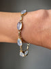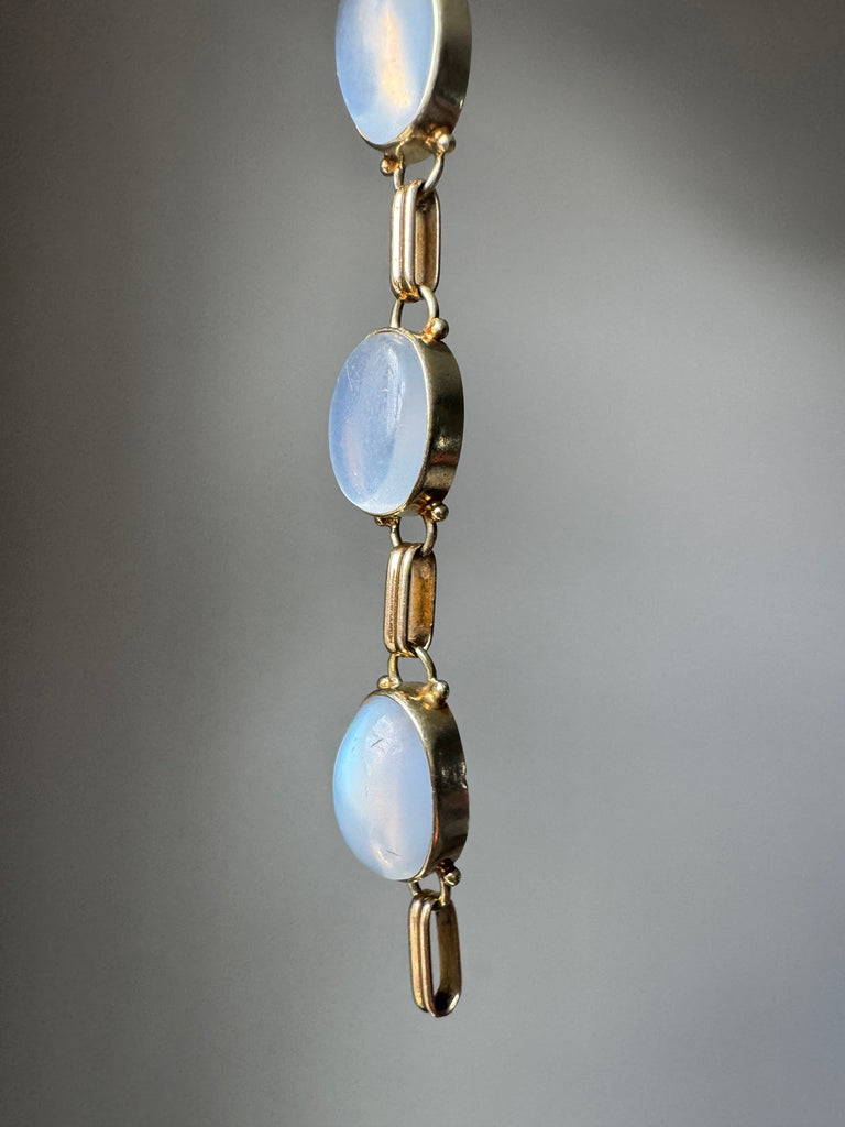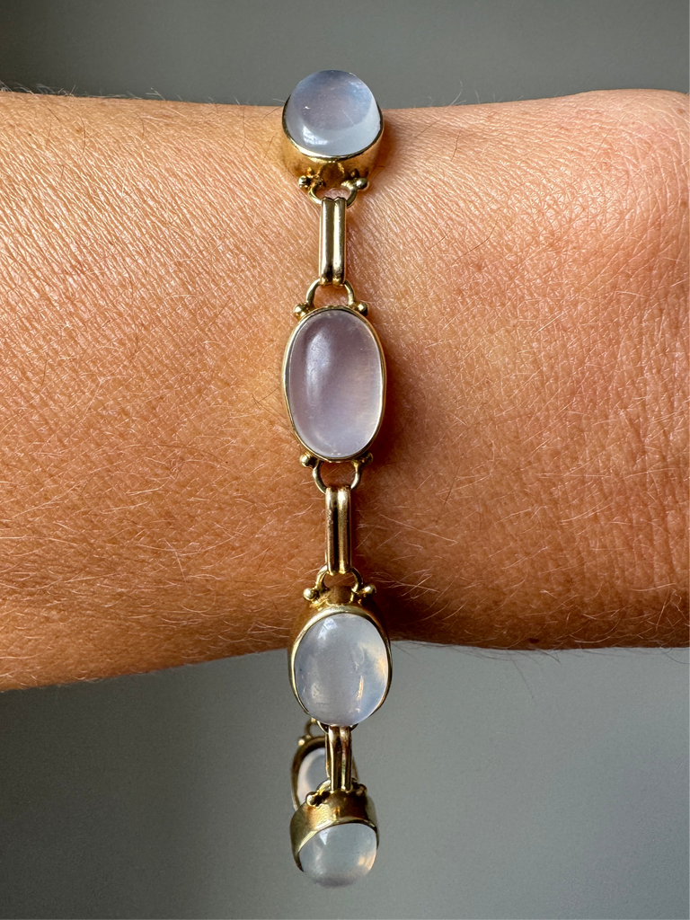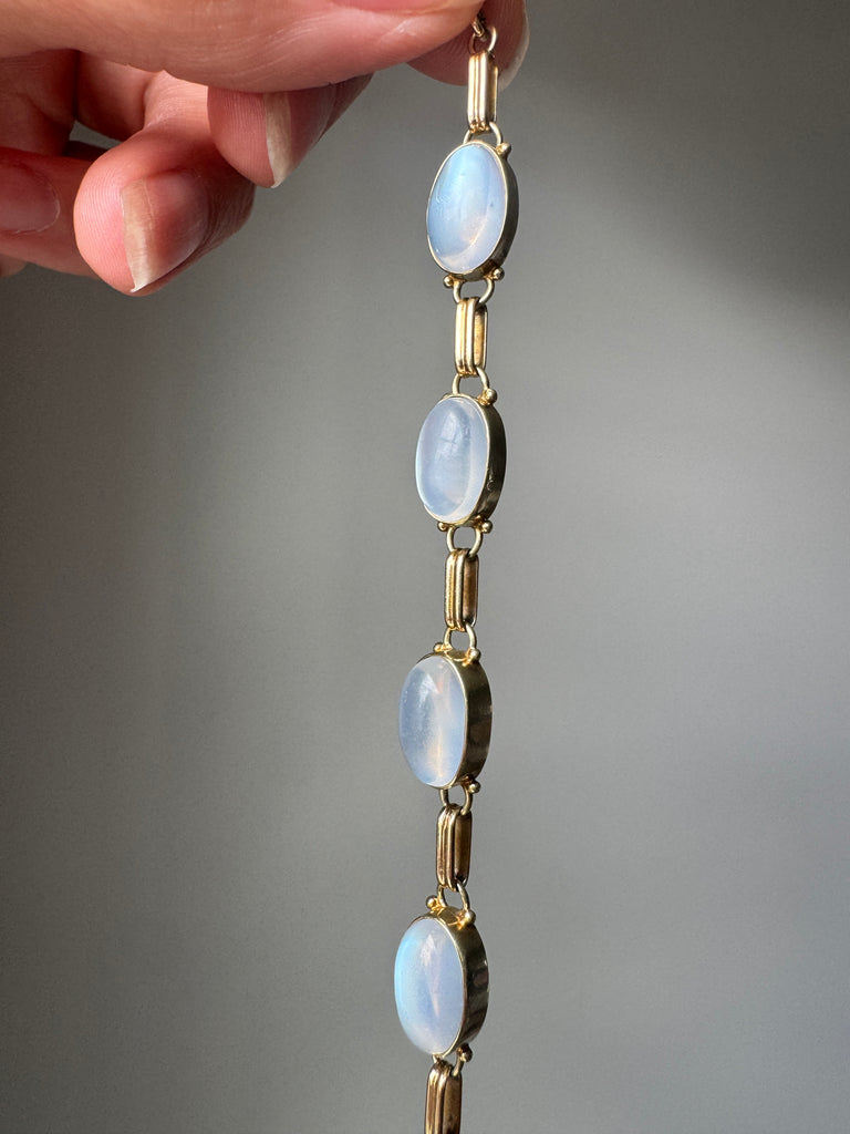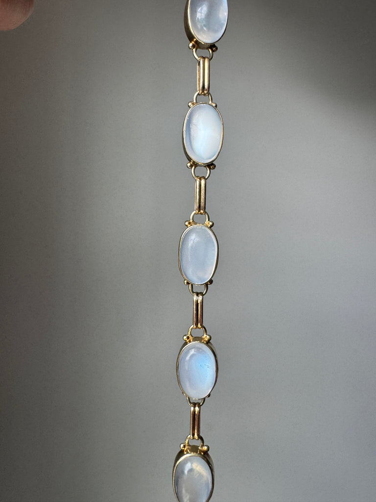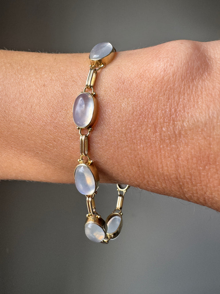 This luminous mid-century bracelet features eight billowy, blue-sheen cabochon moonstones bezel-set in 14k rosy-yellow gold. Bracelet measures a wearable 7 3/4 inches.