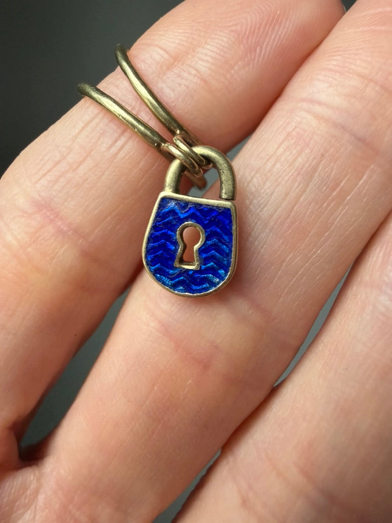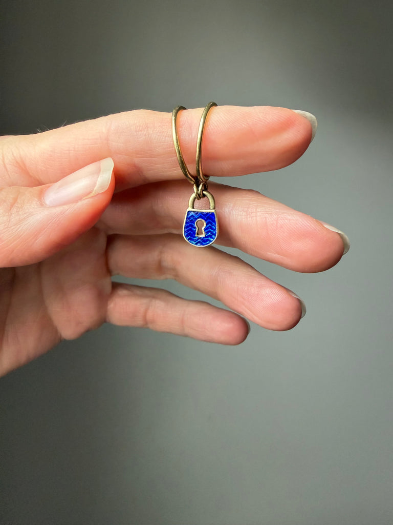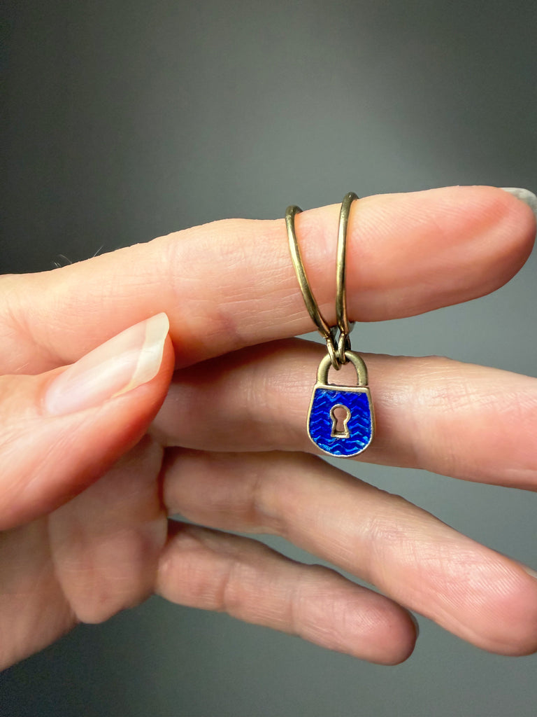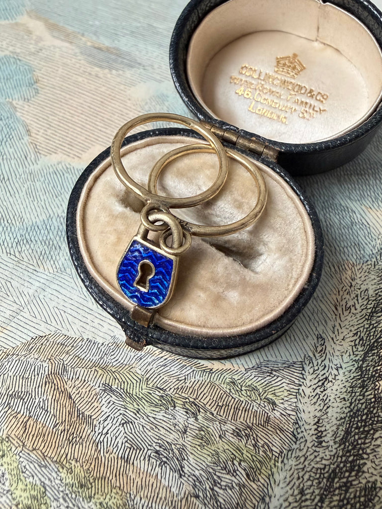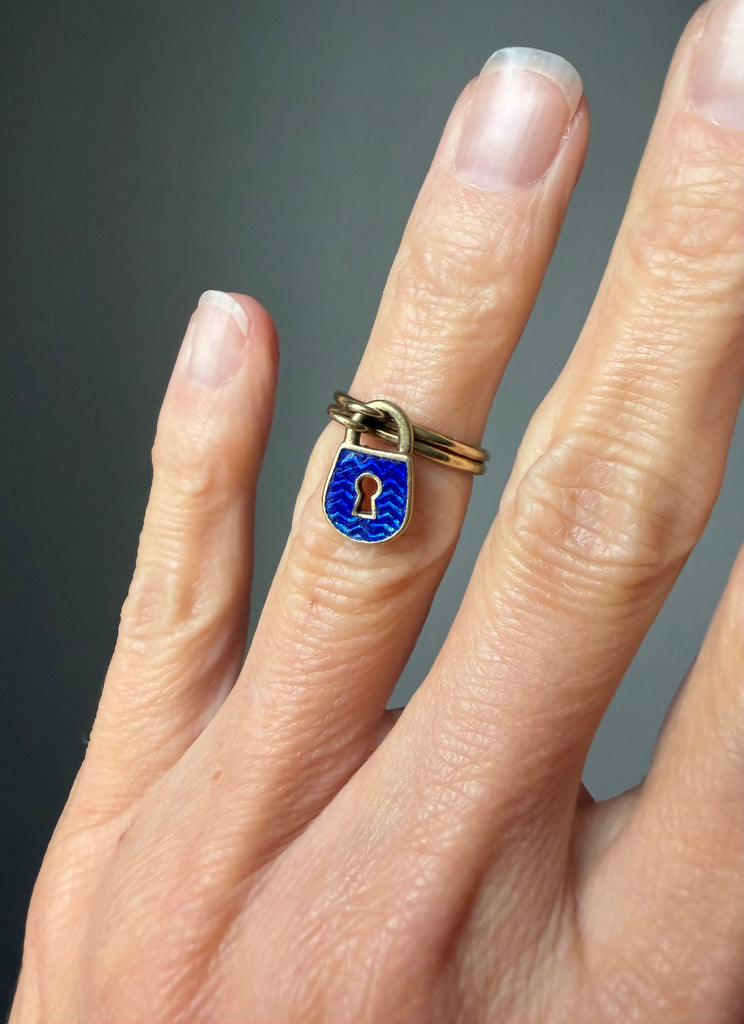 Antique 14K Blue Guilloche Enamel Love Padlock Lock Ring