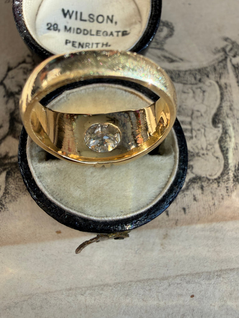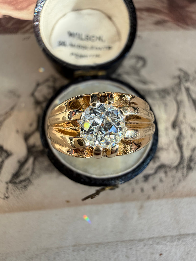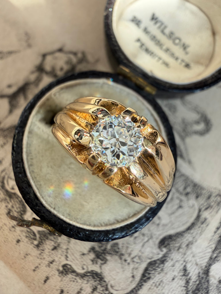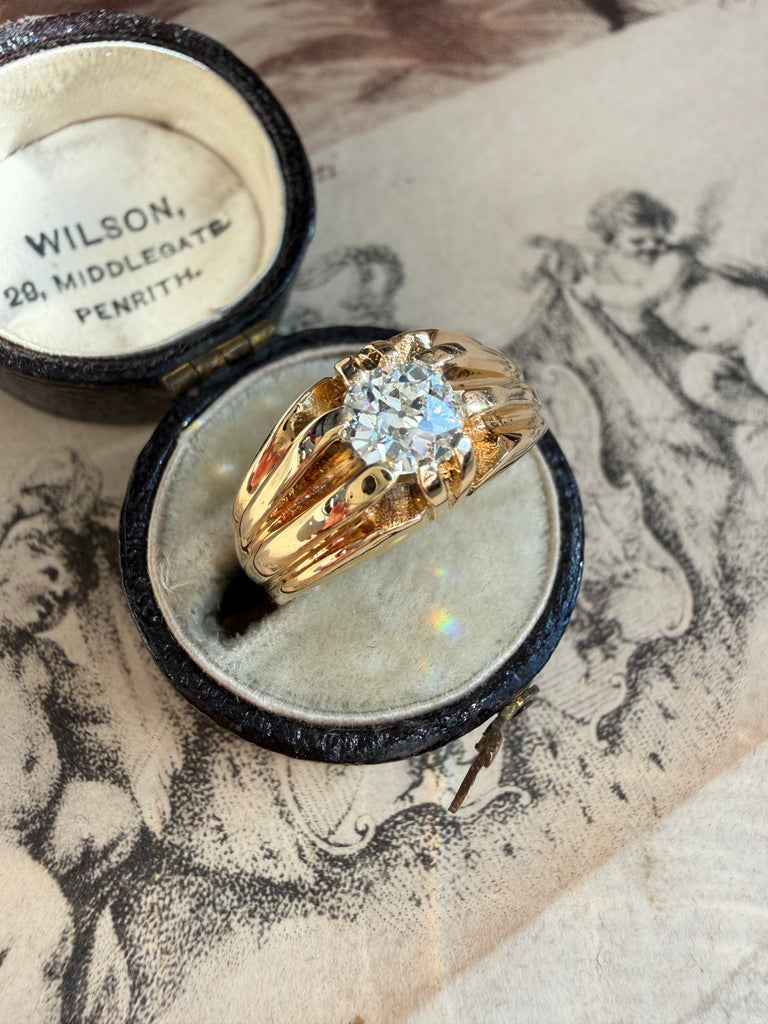 Dating to the turn of the last century, this lovely Victorian diamond ring features a sparkling .80 carat antique old mine-cut diamond set in a gleaming 18k gold belcher style mounting. The ring has a timeless, unisex design perfect for a man or woman. Currently a finger size 5.5