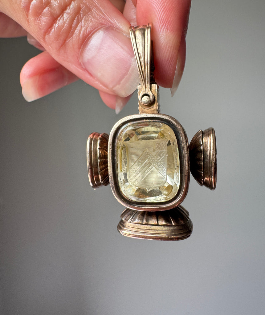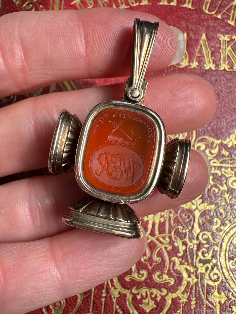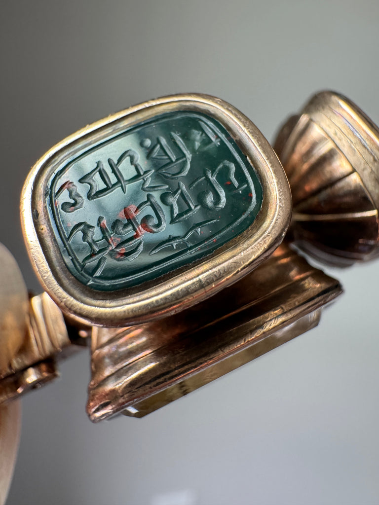 This fascinating five-sided watch key fob, crafted in richly patinated rose gold, encapsulates a mid-19th century life of faith, intellect and global reach. Each intaglio reveals a facet of the original owners personal, spiritual and cultural identity. It was both a tool and a talisman. Part watch key, part portable portrait of self. Acquired in London, an old port city shaped by centuries of trade and migration, this rare object survives as a jewel of cultural convergence.
