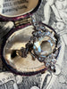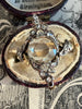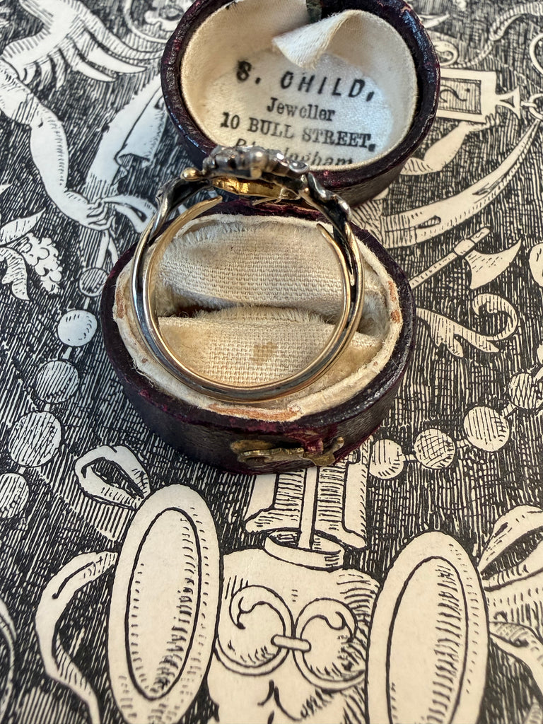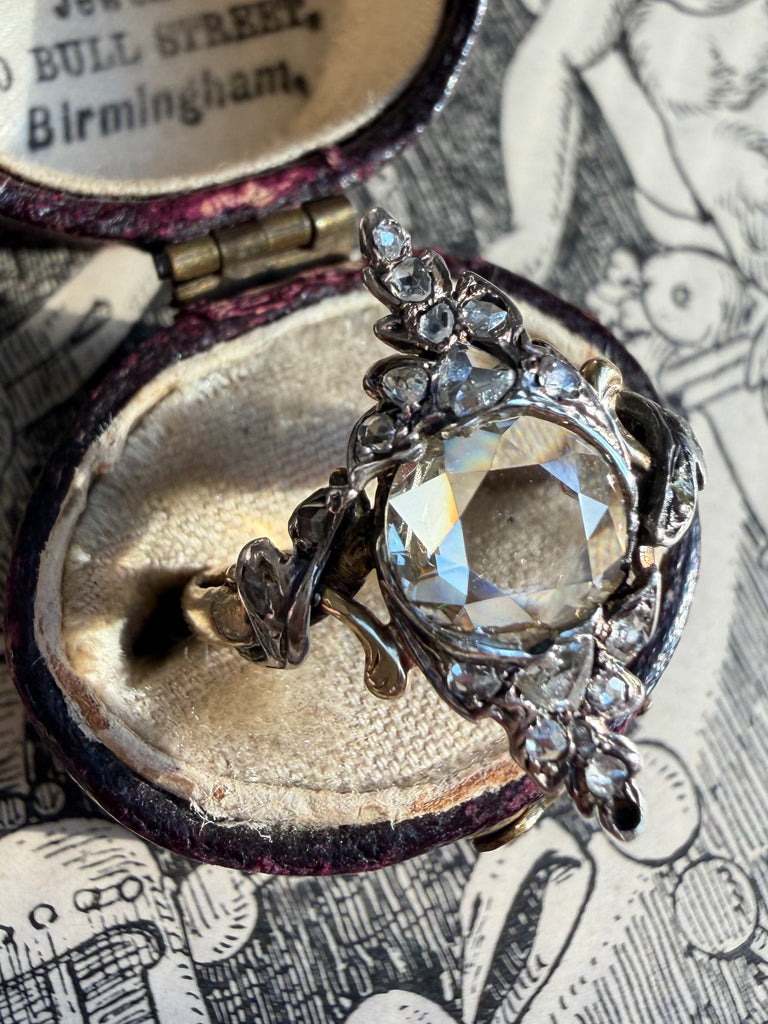 Notes: The main diamond is a .62 carat antique rose cut diamond replacement. It's unknown what to original center gemstone was. The rose cut has some small chips on the girdle hidden under the setting that can only be seen under magnification. Missing one tiny rose cut at the tip of one cluster.