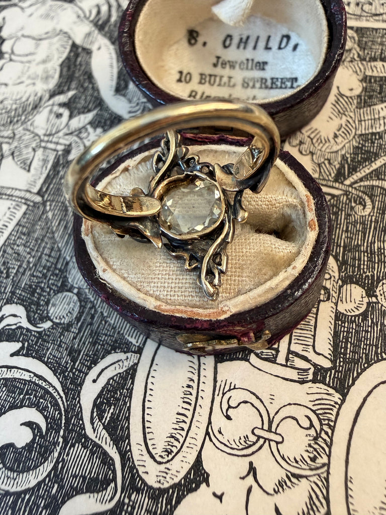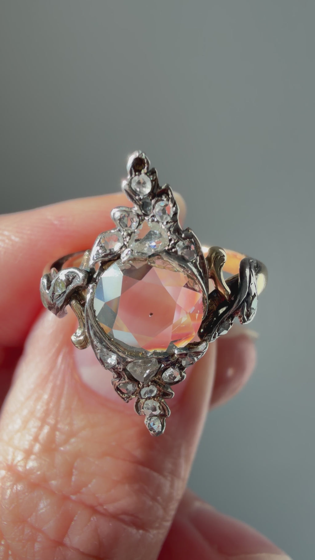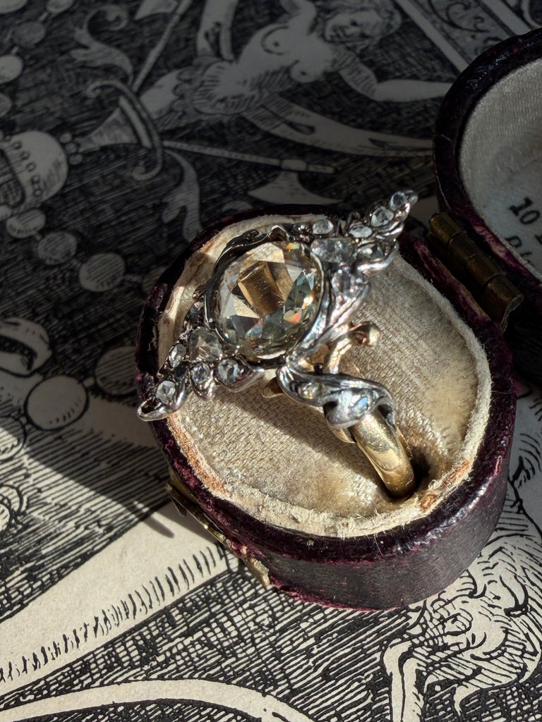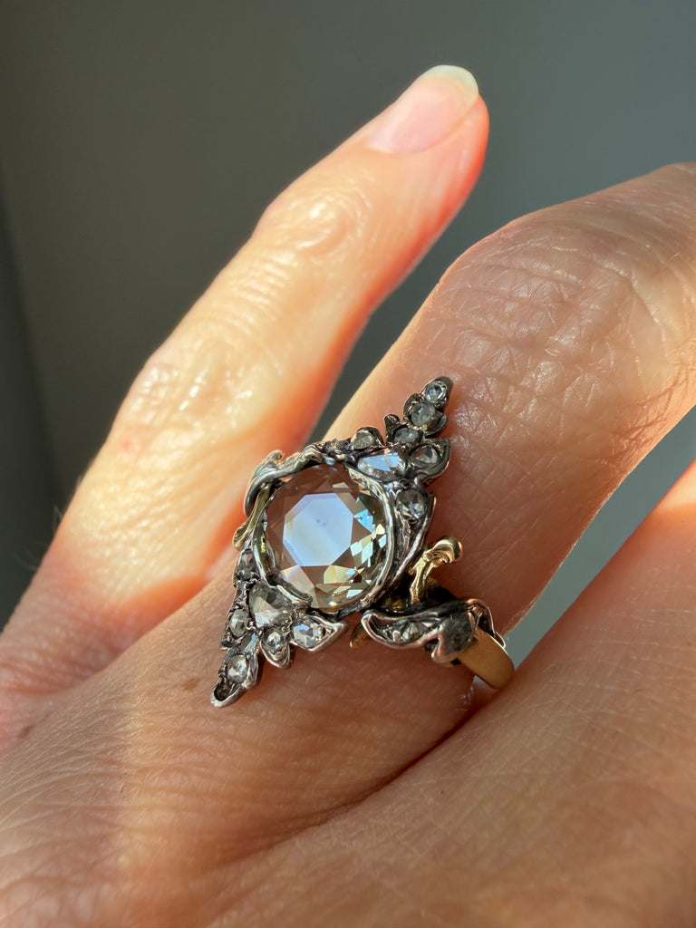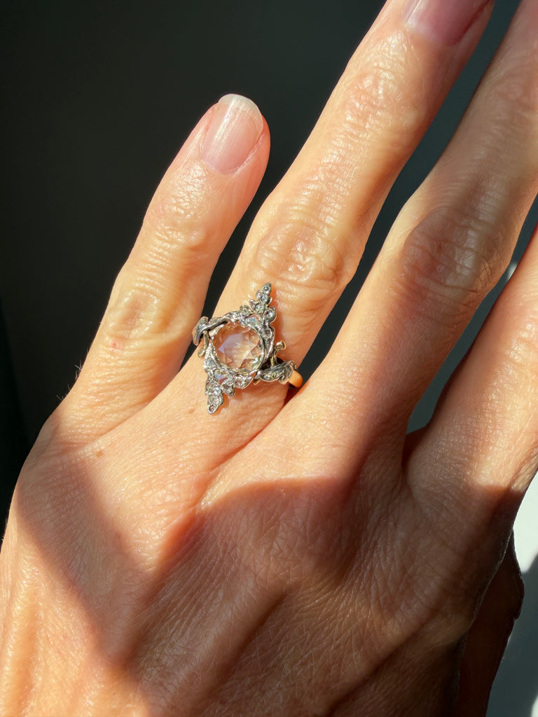 This romantic ring centers on a luminous .62 carat rose cut diamond framed by clusters of tiny rose cut diamonds set to form delicate foliate sprays. Hand fabricated in silver and gold with a rich patina. A whimsical treasure.