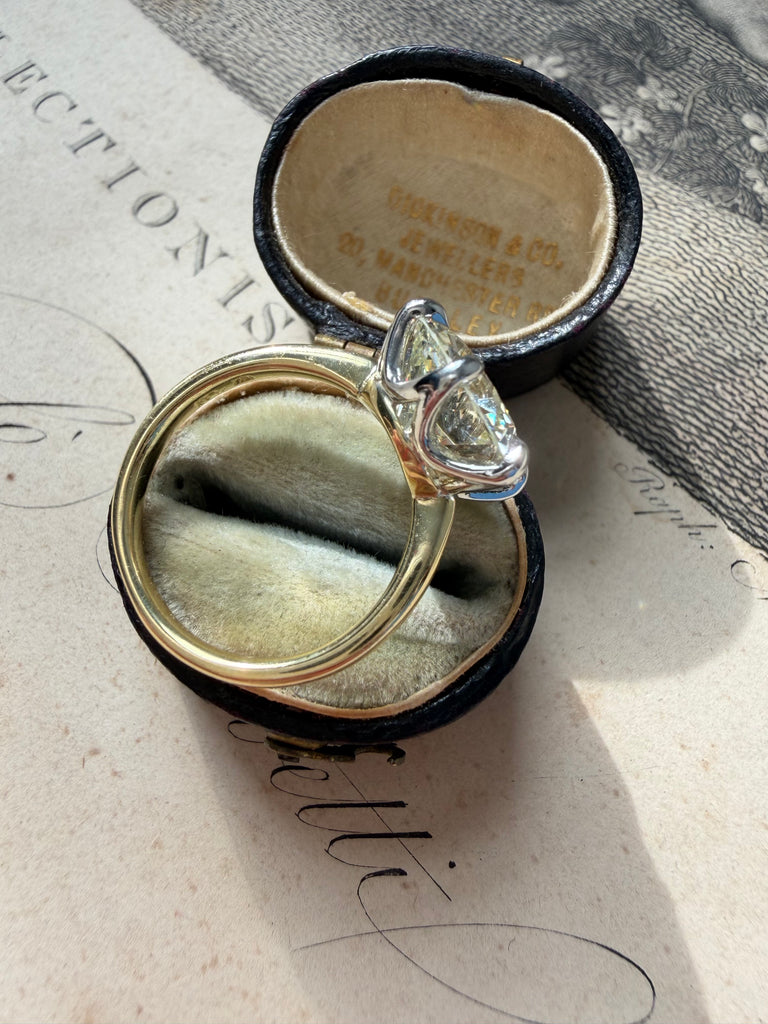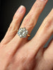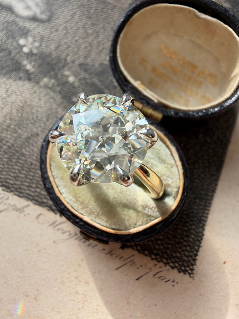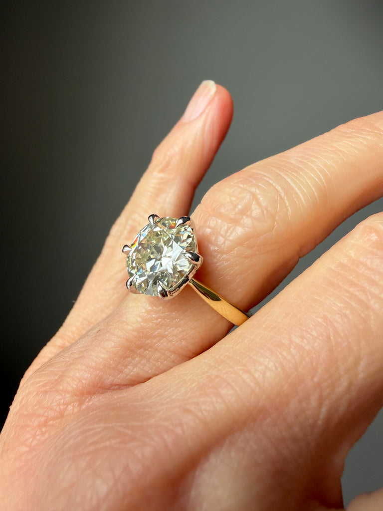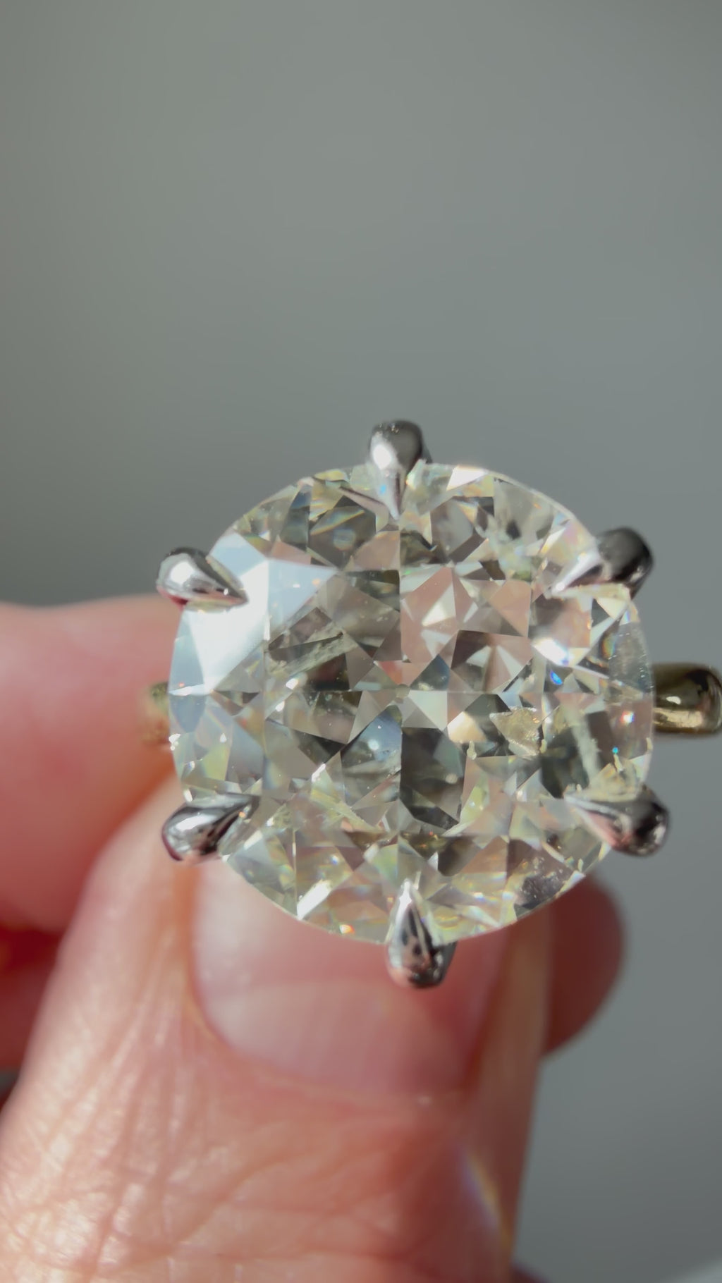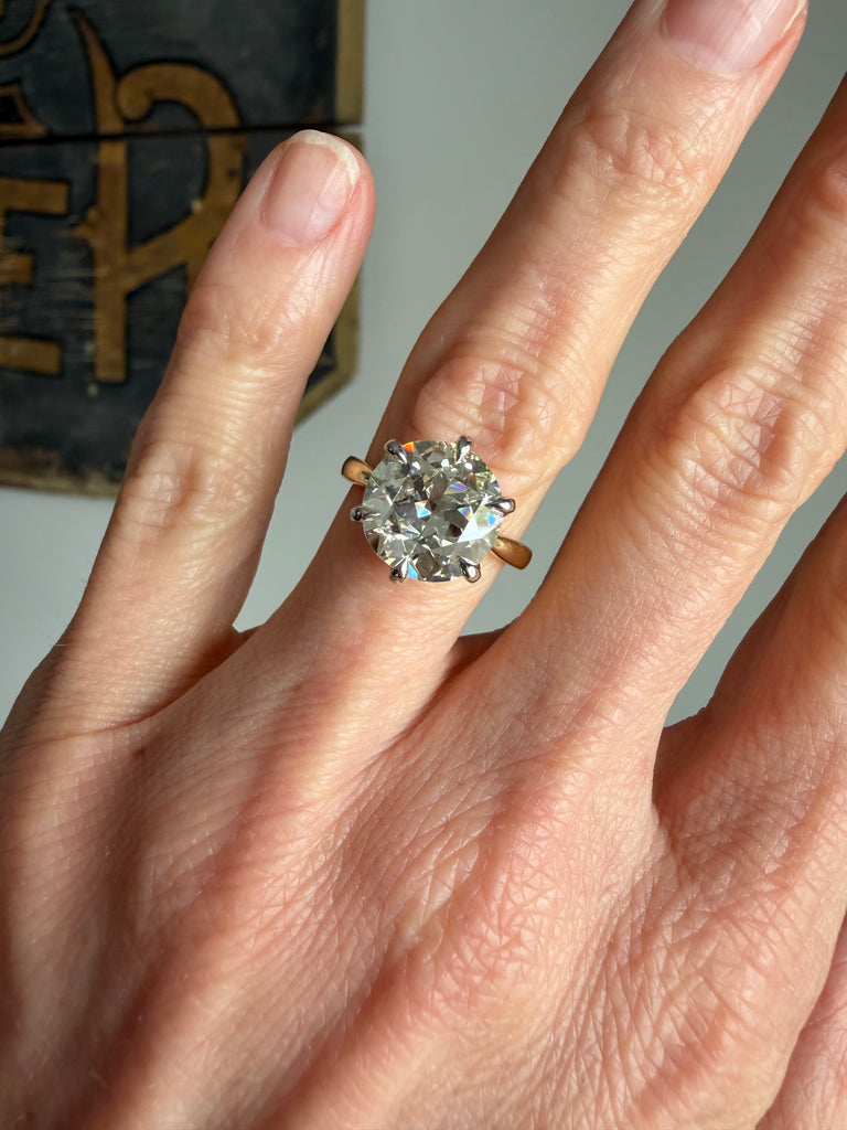 This breathtaking, vintage inspired engagement ring showcases a scintillating 4.37 carat European-cut diamond, graded SI2 clarity with a soft K color. The early 20th century diamond is gracefully presented in sculpted platinum prongs atop an 18 karat gold band. A study in understated elegance. Understated elegance at Its finest. Currently a ring size 5 1/4.