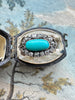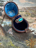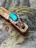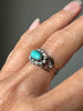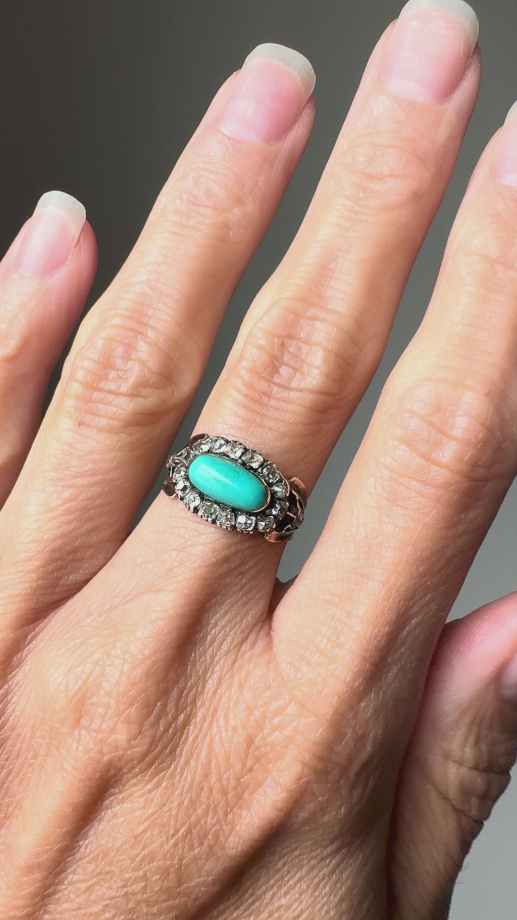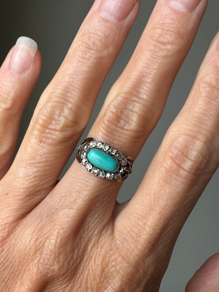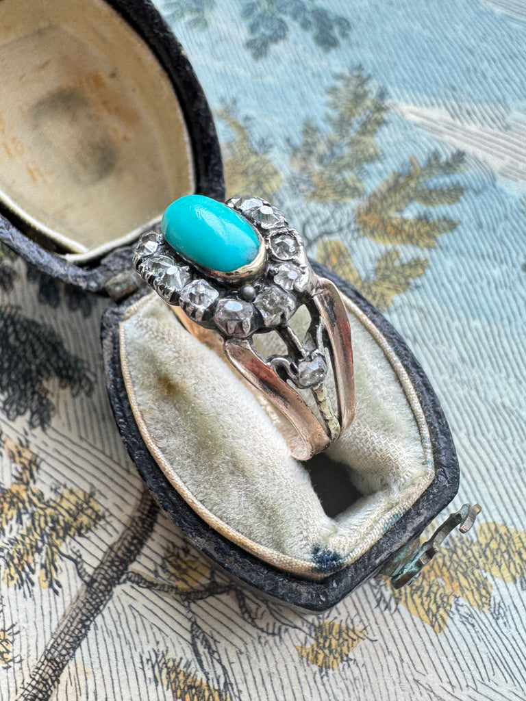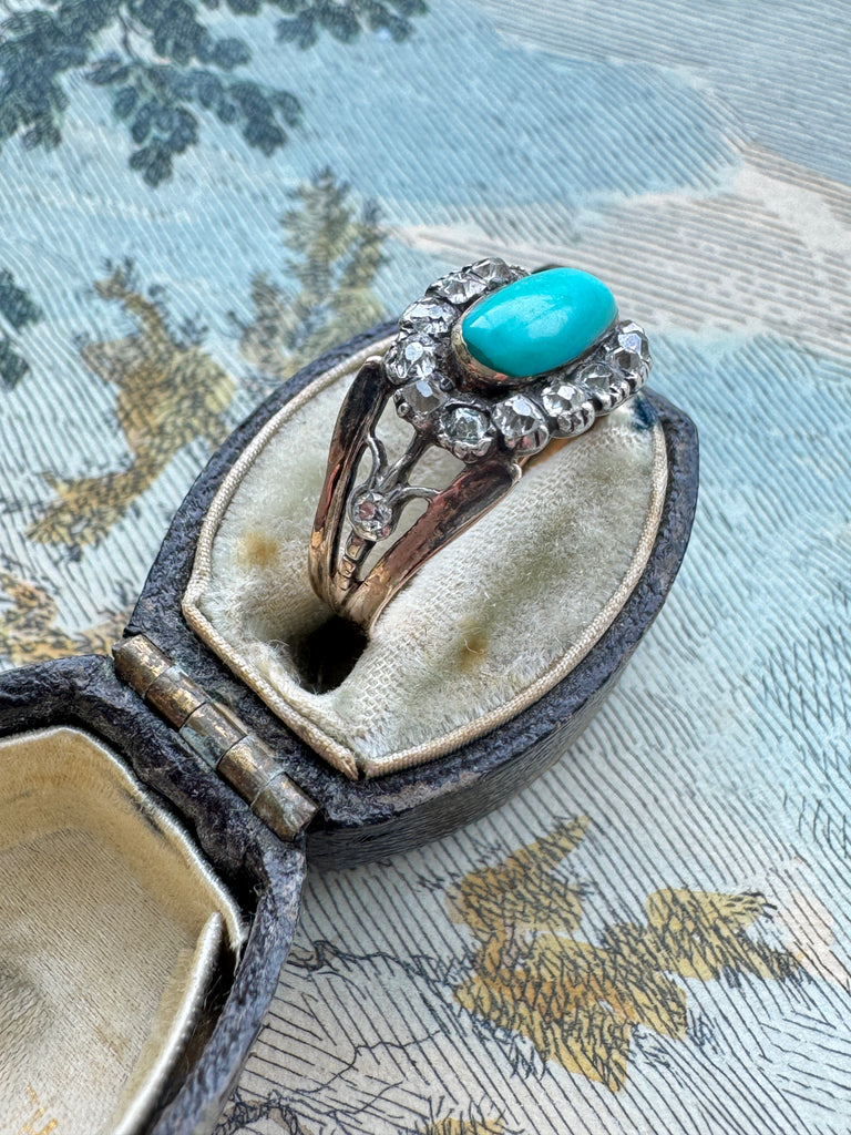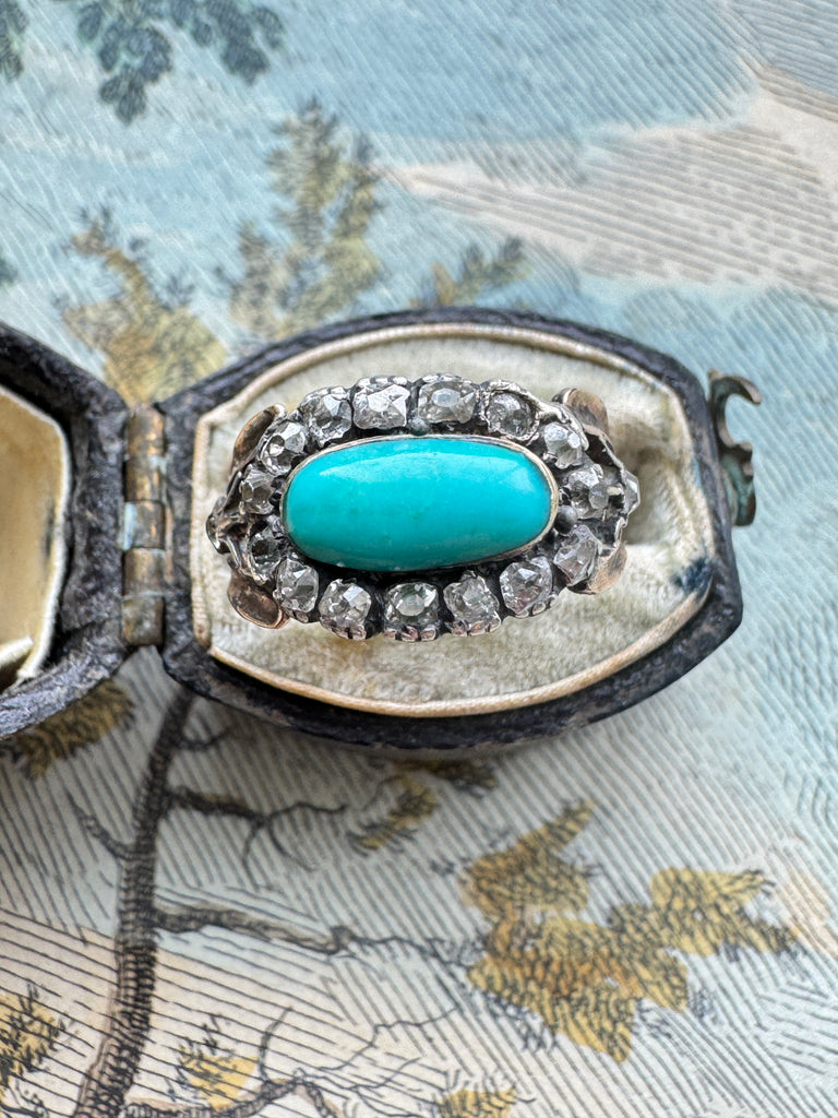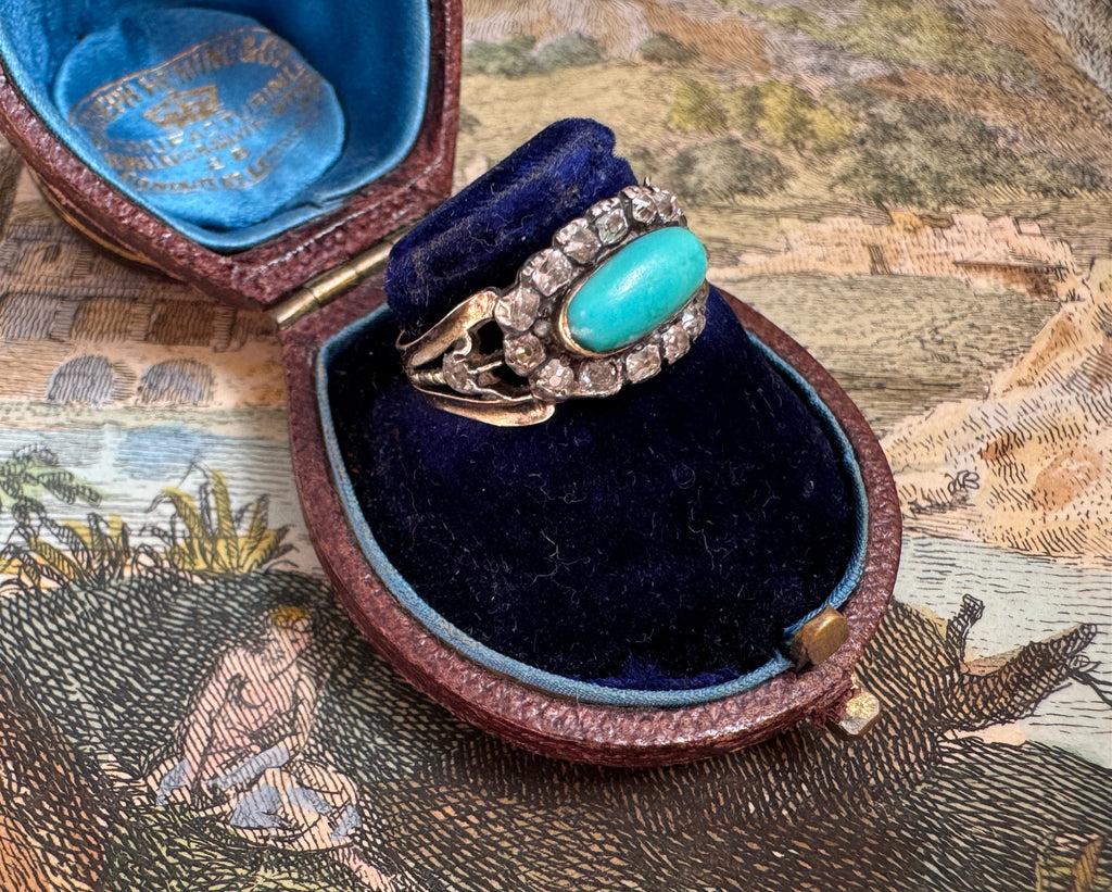 A jewel steeped in over two centuries of history, this early 19th-century Georgian ring showcases a vibrant cabochon turquoise embraced wrapped in a halo of twinkling old-cut diamonds. The setting is handcrafted in 9-carat rose gold and silver, displaying the airy, lightweight construction typical of Georgian jewels. The interior of the band is inscribed “1802”, an intimate reminder of the lives it has touched since the dawn of the 19th century.